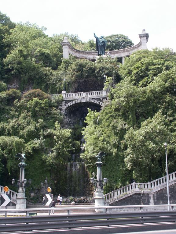 see the statue, the semi-circle columns surrounding it, and the waterfall
