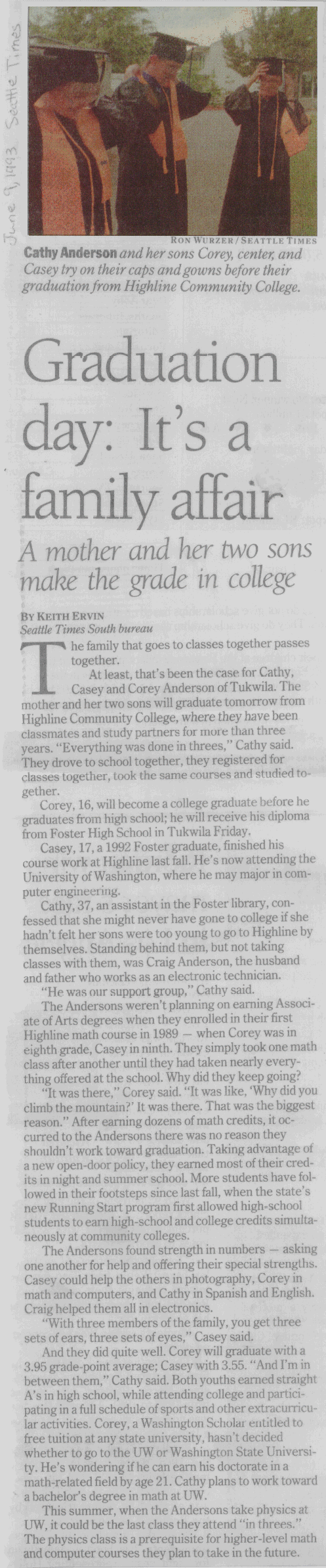 appeared in a local newspaper about Cathy, Casey, and Corey graduating from Highline Community College and the University of Washington. Please be patient as these