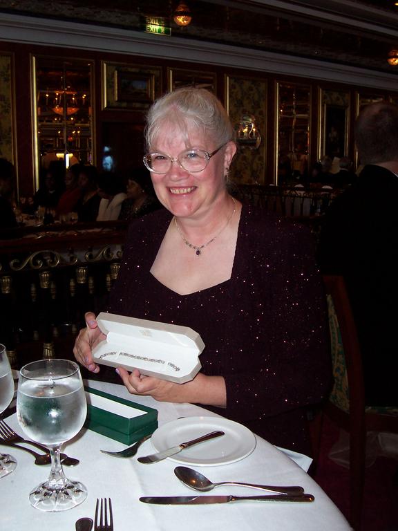Dad saw this very nice diamond bracelet in the on-ship store and bought it for Mom for their 30th anniversary. He actually had me buy it, because he wasn't sure yet when he would give it to her and didn't want to have the charge appear on the room bill if he decided to wait. Even more fun, though, was that, because it was double-discount day at the Galleria onboard, and because I was lucky enough to find the 20% off card, we got it at 40% off. Fun!